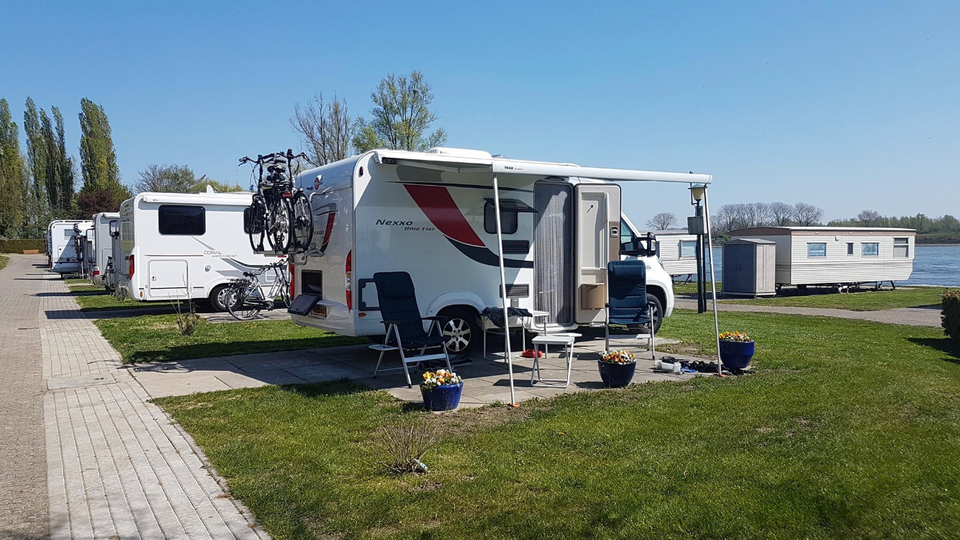 Terrassencampingplatz mit 150 Plätzen im Deichvorland an der Waal. Genuss pur auf einem unserer schönen, ruhigen und komfortablen Plätze mit fantastischer Aussicht auf den Fluss mit Blick auf die stets geschäftige Schifffahrt.