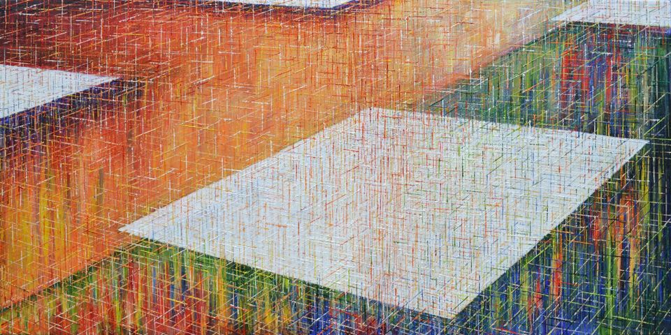 Neben der traditionellen Maltechnik druckt er Holzschnitte mit Ölfarbe von Hand auf Leinen. Auf diese Weise bringt er Bewegung und Struktur in sein Werk. Eine andere Technik, die er selbst entwickelt hat, ist das Auftragen von Farblinien in Mustern auf die Leinwand mit selbstgebauten Werkzeugen. Dadurch entsteht eine Struktur, bei der es so aussieht, als würde er mit Farbe auf der Leinwand weben. Die Kombination dieser Techniken, mit denen er immer wieder experimentiert, sorgt dafür, dass seine Bilder dreidimensional werden. Die Farbe interagiert mit dem Licht und erzeugt faszinierende Schatten und Tiefe.