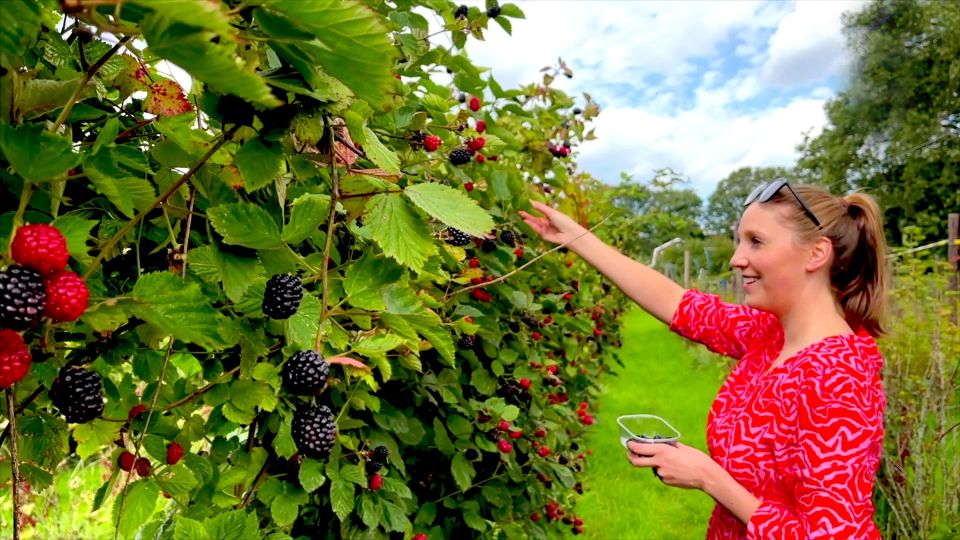 Natürlich können Sie auch in den Pflückgarten gehen und Ihre eigene Schale mit Sommerfrüchten pflücken (gegen eine Gebühr). Zurzeit gibt es rote Beeren, schwarze Beeren, weiße Beeren, Stachelbeeren, Jostabeeren, süße Brombeeren und große Himbeeren (Taybeeren)! ↵