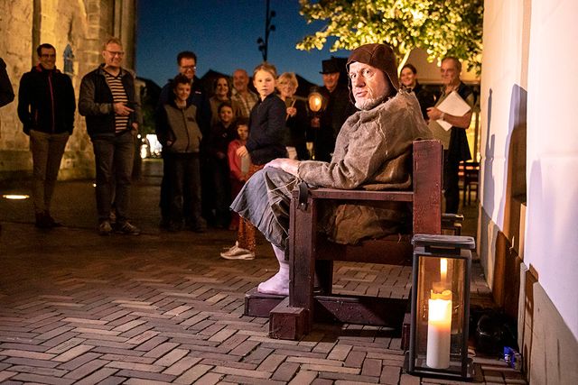 Auge in Auge mit der Vergangenheit von Oldenzaal". Es ist dunkel und ein Führer mit einer Laterne erwartet Sie, um Sie auf eine Entdeckungsreise durch Oldenzaal im Licht der Laterne mitzunehmen.