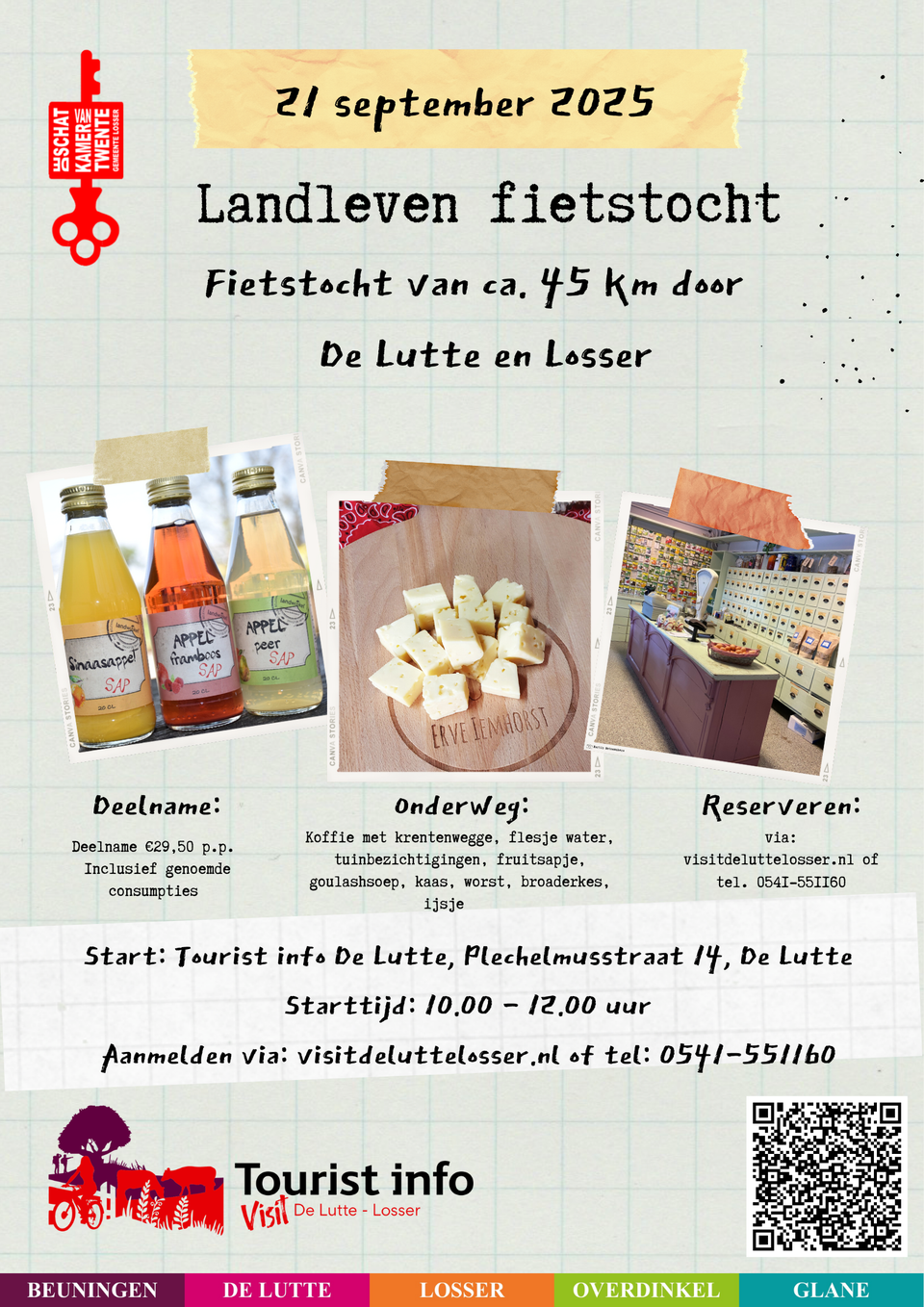 Sie können zwischen 10.00 - 12.00 Uhr von der Touristeninformation De Lutte in der Plechelmusstraat 14 in de Lutte starten. Die Teilnahme beträgt
