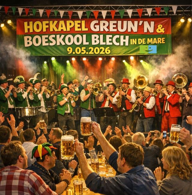 Am Samstag, den 9. Mai, wird De Mare das musikalische Herz des Dorfes sein. Die Männer von Hofkapel Greun'n und die Topper von Boeskool Blech werden gemeinsam auf der Bühne stehen. Rechnen Sie mit einem Abend voller Energie, krachendem Blech und vor allem viel Spaß.
